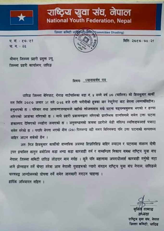 अत : निज शिबकुमार कार्किको वास्तविक अबस्था शिघ्रातिशिघ्र बाहिर ल्याउन र घटनमा संलग्न पहिचान गरी दोषी उपर प्रचलित कानुन बमोजिम कडा भन्दा कडा कारबाही गर्न र सम्बन्धित निकाय समक्ष राष्ट्रिय युवा संघ नेपाल,जिल्ला कार्य कमिटी धादिङ जोडदार माग गर्दछ ।