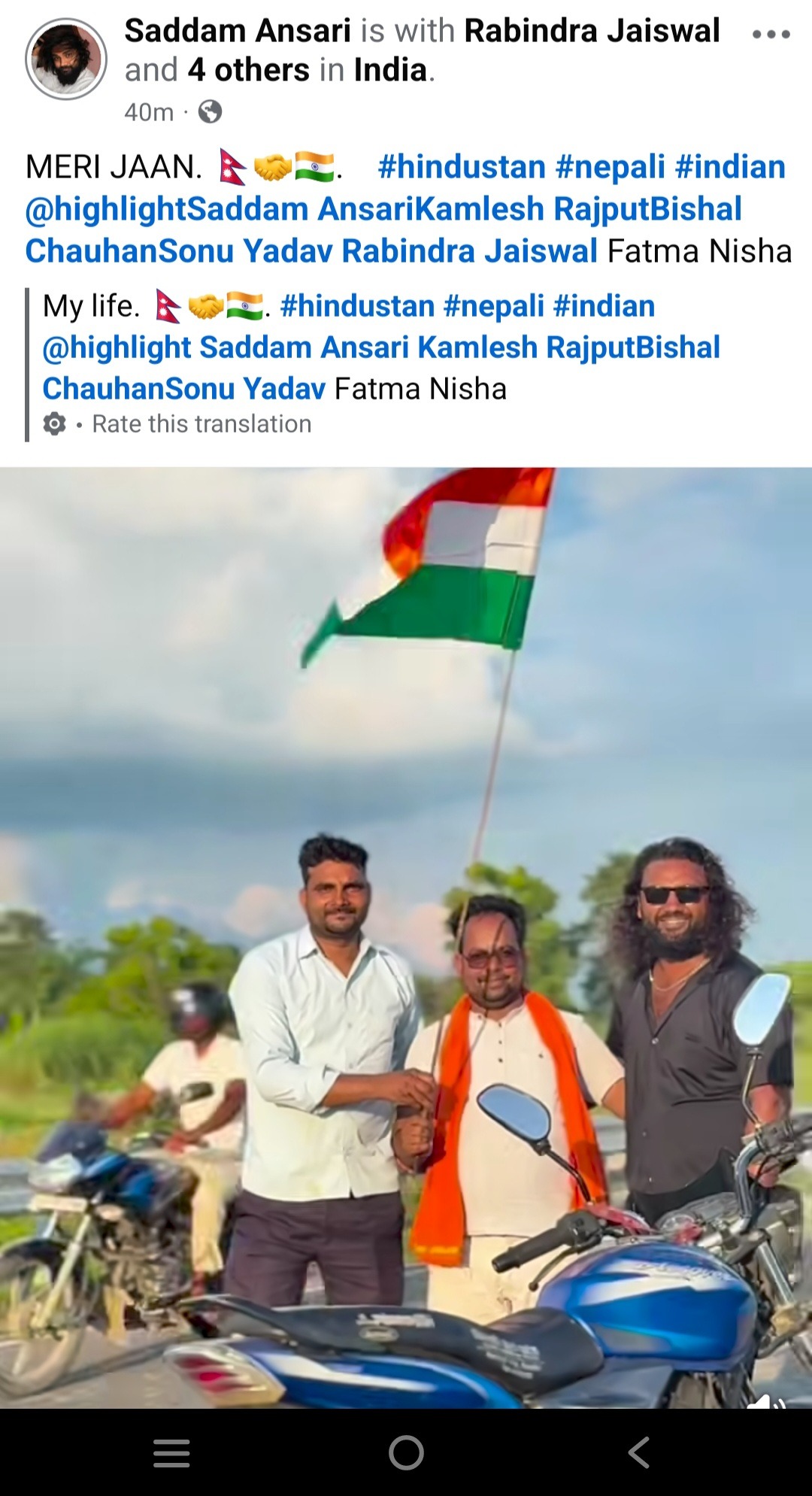 आफ्नो राष्ट्रको हितमा नहेरी यसरी अन्य देशको स्वतन्त्रता दिवसको अवसरमा अन्य देशको झण्डा हातमा लिएर हिन्दुस्तान मेरि जान भनेर भारतको झण्डा फहराउने नेपाली काङ्ग्रेस सभापति जयसवाल र दिपक माध्यमिक विद्यालाय शिक्षक अन्सारीले आफुहरुले निकै ठुलो कार्य गरेको भन्दै एउटा सानो भिडियो सहित समाजिक संजालमा समेत पोस्ट गरेका छन।