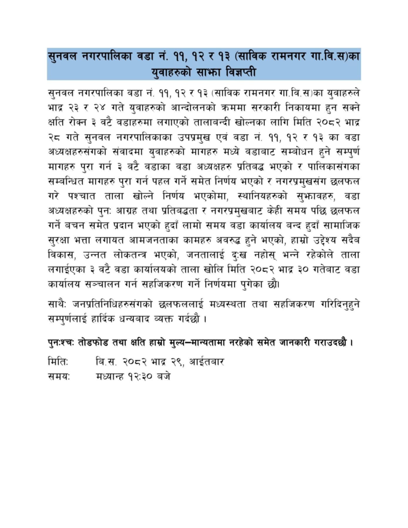 सुनवल।पश्चिम नवलपरासीको सुनवल नगरपालिका–११, १२ र १३ (साबिक रामनगर गा.वि.स) का युवाले सञ्चालन गरेको आन्दोलनपछि ताला लगाइएका वडा कार्यालयहरू आगामी भदौ ३० गतेदेखि पुनः खुल्ने भएका छन्।भदौ २३ गतेदेखि सुरु भएको युवाको आन्दोलनका क्रममा वडा कार्यालयमा तालाबन्दी गरिएको थियो।