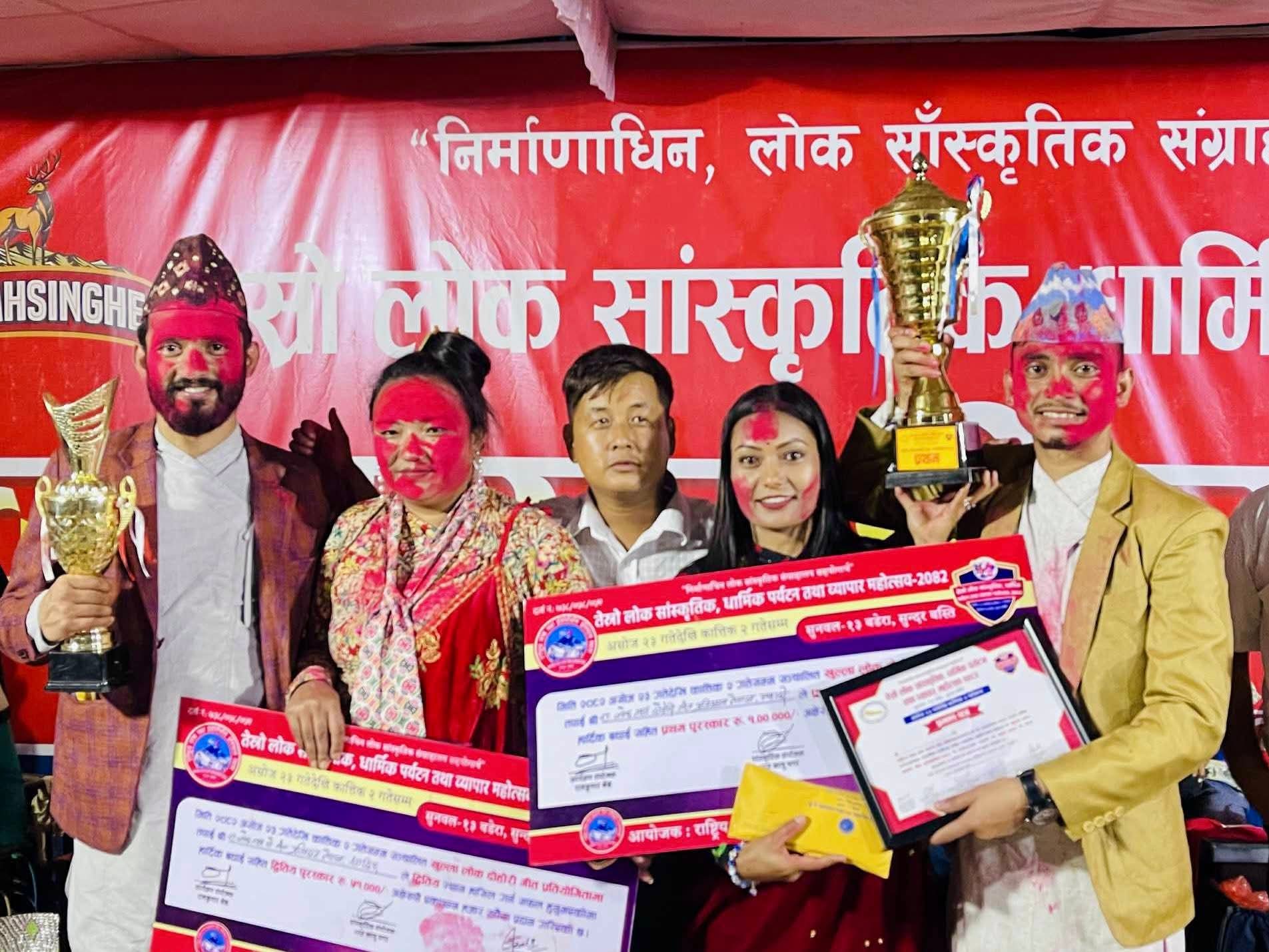 सुनवल।पश्चिम सुनवल–१३ बडेरा सुन्दर बस्तीमा जारी तेस्रो लोक सांस्कृतिक,धार्मिक पर्यटन तथा व्यापार महोत्सवअन्तर्गत सम्पन्न खुला लोकदोहोरी प्रतियोगितामा म्यादी लोकदोहोरी समूहले पहिलो स्थान हासिल गरेको छ।राष्ट्रिय लोक तथा दोहोरी गीत प्रतिष्ठान नवलपरासीको आयोजनामा लोकदोहोरी प्रतियोगिताको फाइनल प्रतिस्पर्धामा म्यादीले धादिङलाई पराजित गर्दै उपाधि जितेको हो।