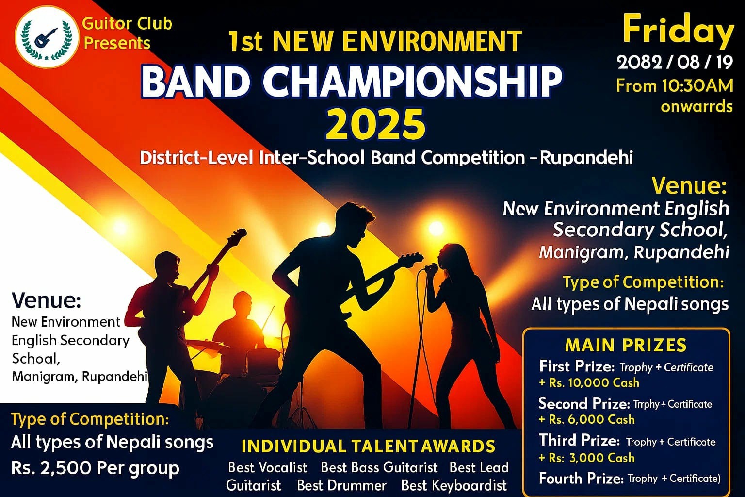 इन्भारमेन्ट गितार क्लवको आयोजनामा रुपन्देही जिल्लाको तिलोत्तमा नगरपालिका – ५ मणिग्राम स्थित यु इन्भारमेन्ट अंग्रेजी स्कुलमा मंसिर १९ गते शुक्रबार कार्यक्रम हुने भएको किशोर बश्यालले जानकारी दिए।
