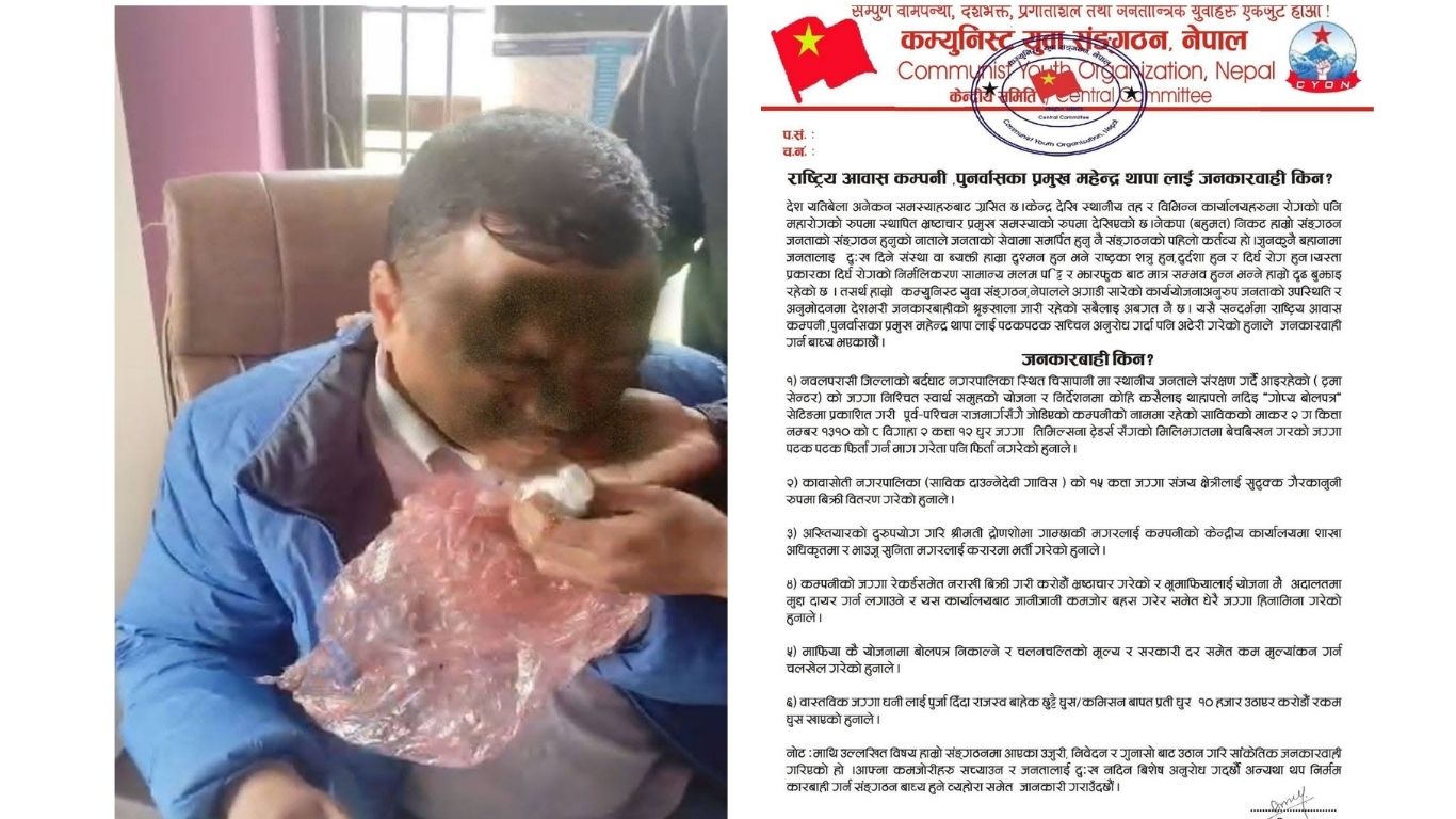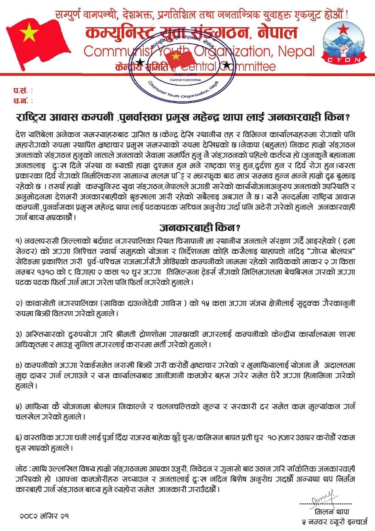 पश्चिम नवलपरासी। राष्ट्रिय आवास कम्पनीका पुनर्वास प्रमुख महेन्द्र थापामाथि नेकपा (बहुमत) निकट कम्युनिस्ट युवा संगठन नेपाल ५ नं. ब्यूरोले कालोमोसो दलेको छ । संगठनका ५ नं. ब्यूरोल संयोजक मिलन थापाले सार्वजनिक गरेको विज्ञप्ति अनुसार महेन्द्र थापाले पुनर्वास परियोजनासम्बन्धी काममा व्यापक अनियमितता, ढिलासुस्ती र घुस-कमिशनसम्बन्धी गतिविधि गरेको आरोप लगाइएको छ।