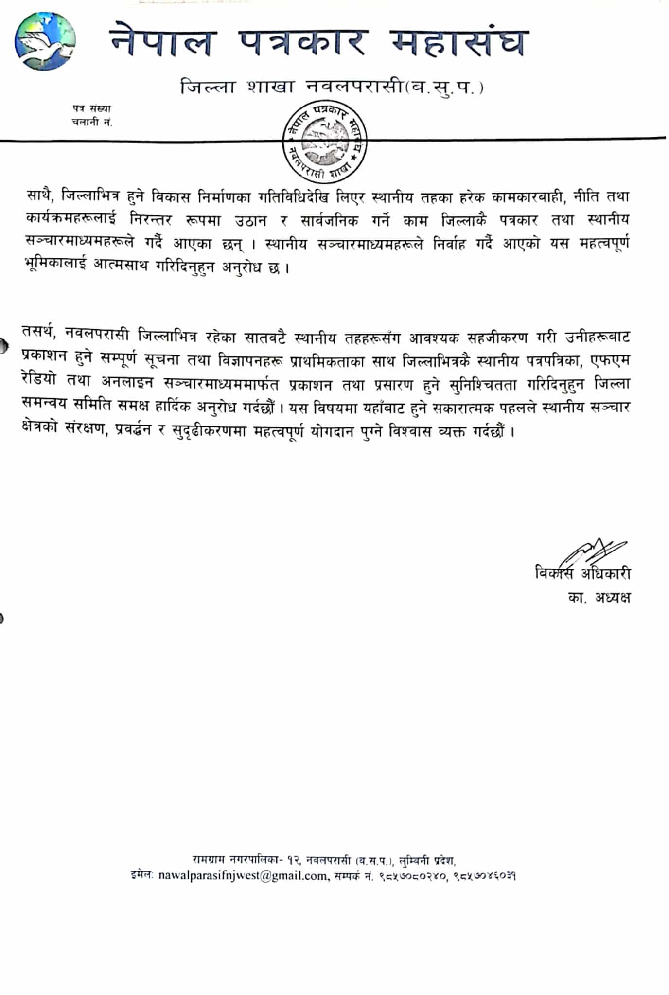 परासी।नेपाल पत्रकार महासंघ,जिल्ला शाखा नवलपरासीले स्थानीय सञ्चारमाध्यमको संरक्षण,प्रवर्द्धन र सुदृढीकरणका लागि जिल्लास्थित स्थानीय तह र सरोकारवाला निकायलाई विज्ञापन तथा सूचनामा प्राथमिकता दिन आग्रह गरेको छ।