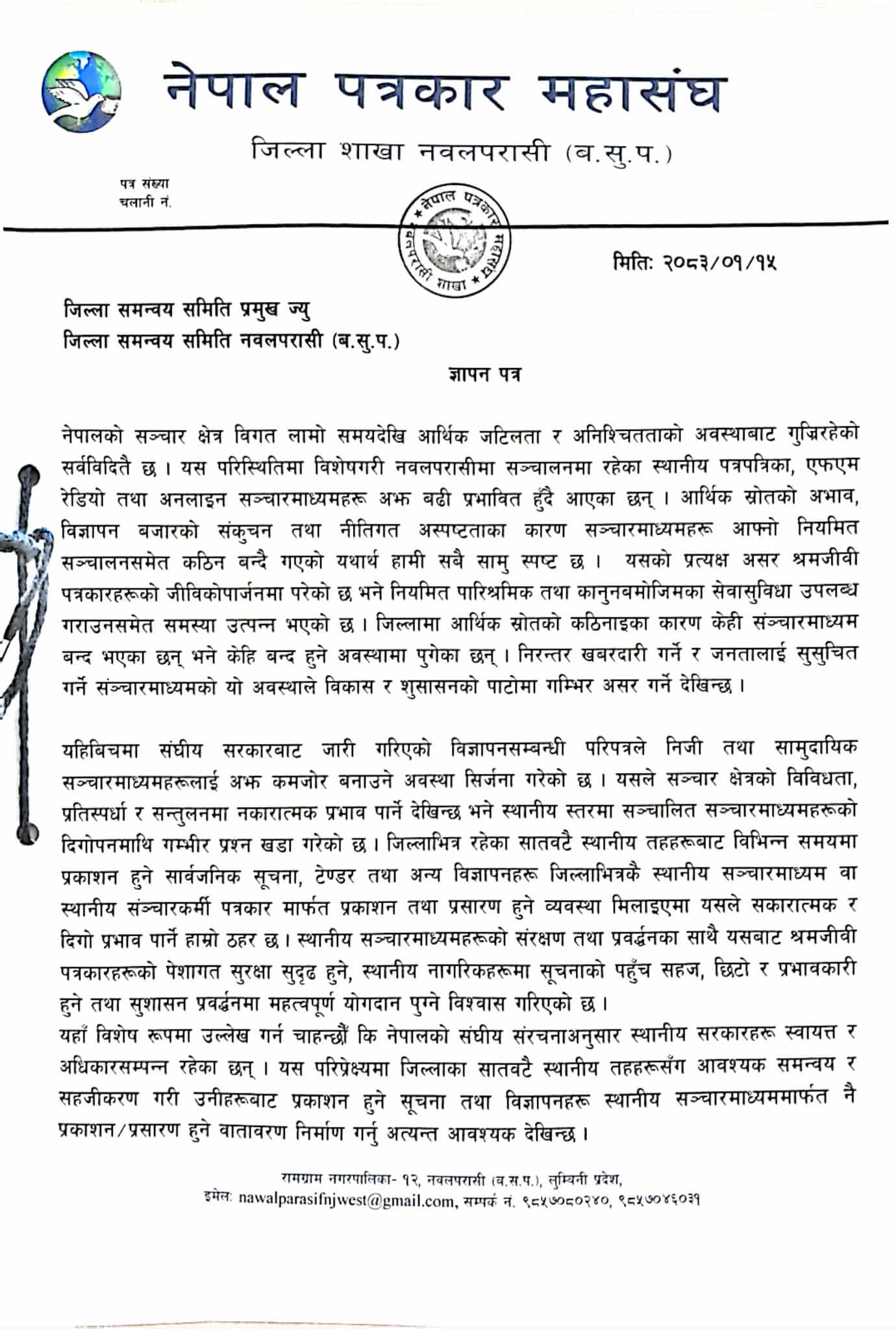 विशेषगरी नवलपरासीमा सञ्चालनमा रहेका स्थानीय पत्रपत्रिका, एफएम रेडियो तथा अनलाइन सञ्चारमाध्यमहरू आर्थिक स्रोतको अभाव, विज्ञापन बजारको संकुचन तथा नीतिगत अस्पष्टताका कारण प्रभावित भएको जनाइएको छ।बिज्ञापनमा केन्द्रको निर्णय नमान्न समेत आग्रह गरिएको छ ।