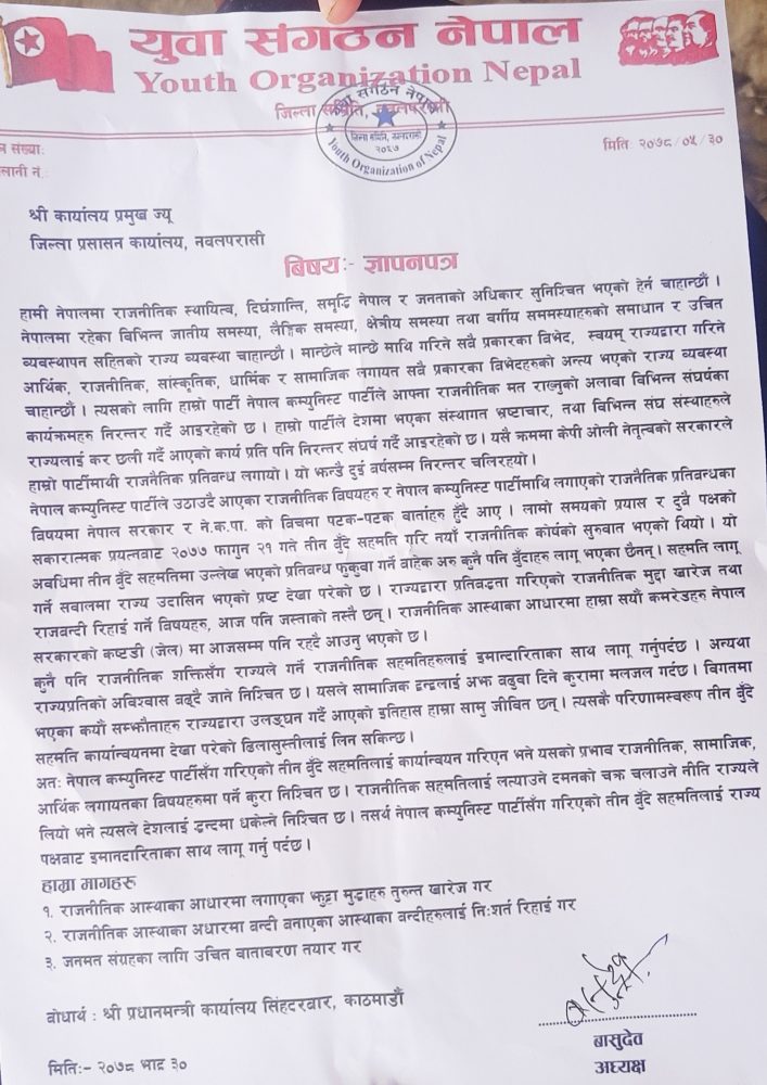 भदौ ३० परासी ।विप्लव नेतृत्वको नेपाल कम्युनिस्ट पार्टी निकट युवा संगठन नेपाल नवलपरासीले जिल्ला प्रशासन कार्यलयमा ज्ञापनपत्र बुझाएको छ । संगठनले ३ बुद्दे माग सहित ज्ञापनपत्र बुझाएको हो।