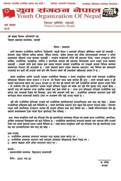 म्यादी संवाददाता। विप्लव नेतृत्वको नेपाल कम्युनिस्ट पार्टी निकट युवा संगठन म्यादी ज्ञापन पत्र बुझाएको छ । संगठनले प्रधानमन्त्री कार्यलयलाई बोधार्थ गरि प्रमुख जिल्ला अधिकारी मार्फत ज्ञापनपत्र बुझाएको हो ।