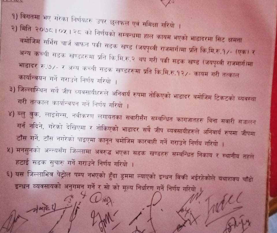 जिल्ला समन्वय समितिकाे सभाहलमा समन्वय समितिका सँयाेजक रहनुभएका खडक बहादुर खड्काकाे अध्यक्षतामा सुरु भएको बैठकले जिल्लामा चल्ने जिपकाे भाडादर कायम गरिएको हाे।