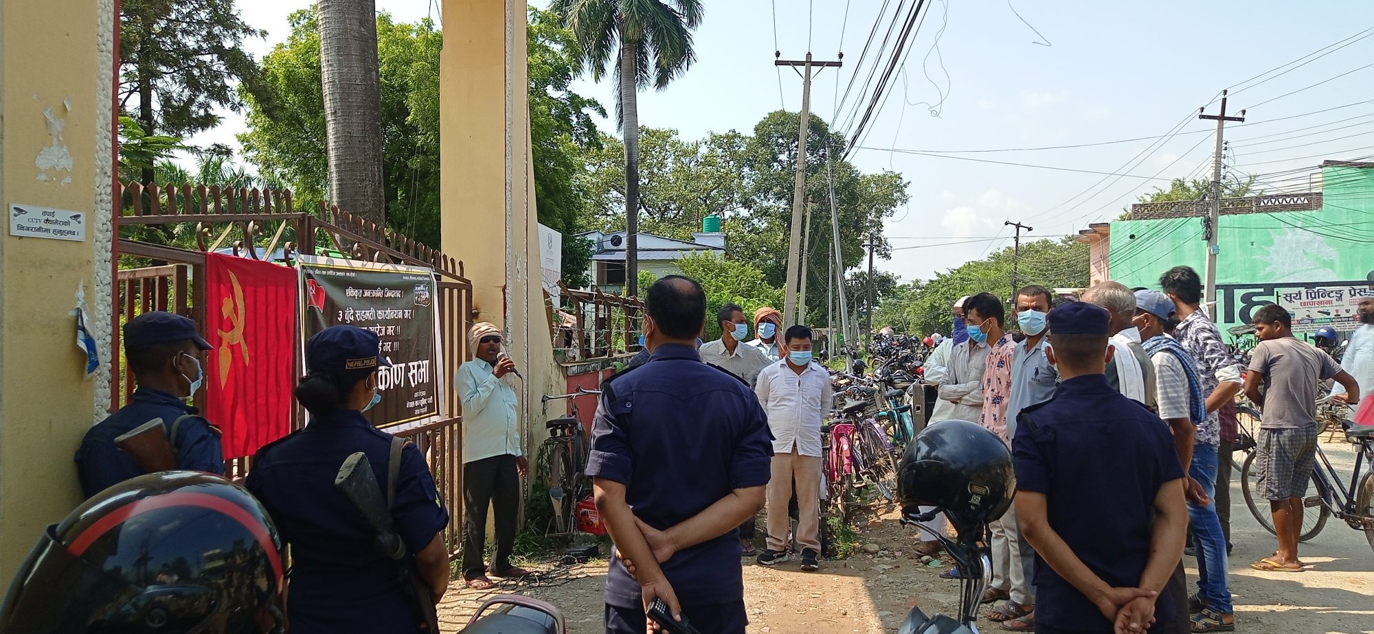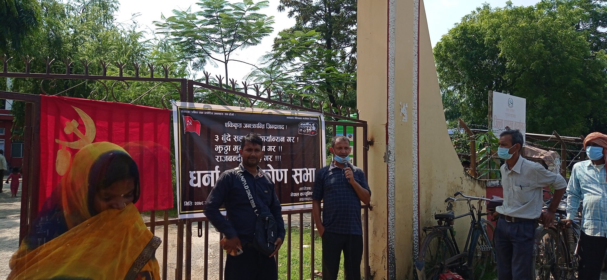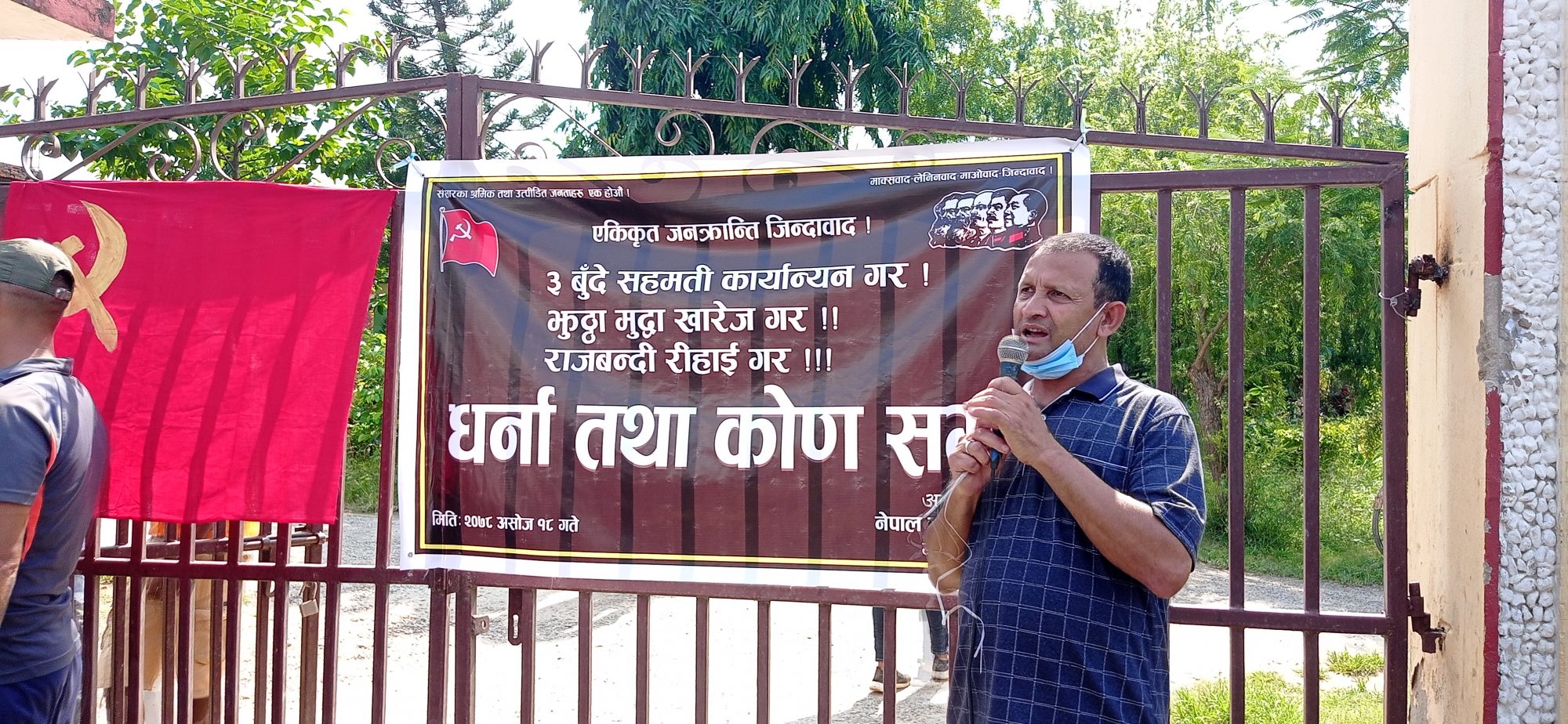 नेकपाले जिल्ला प्रशासन कार्यालय परासी अगाडिबाट कालो ब्यानरसहितको कोणसभा र धर्ना कार्यक्रम गरेको थियो।