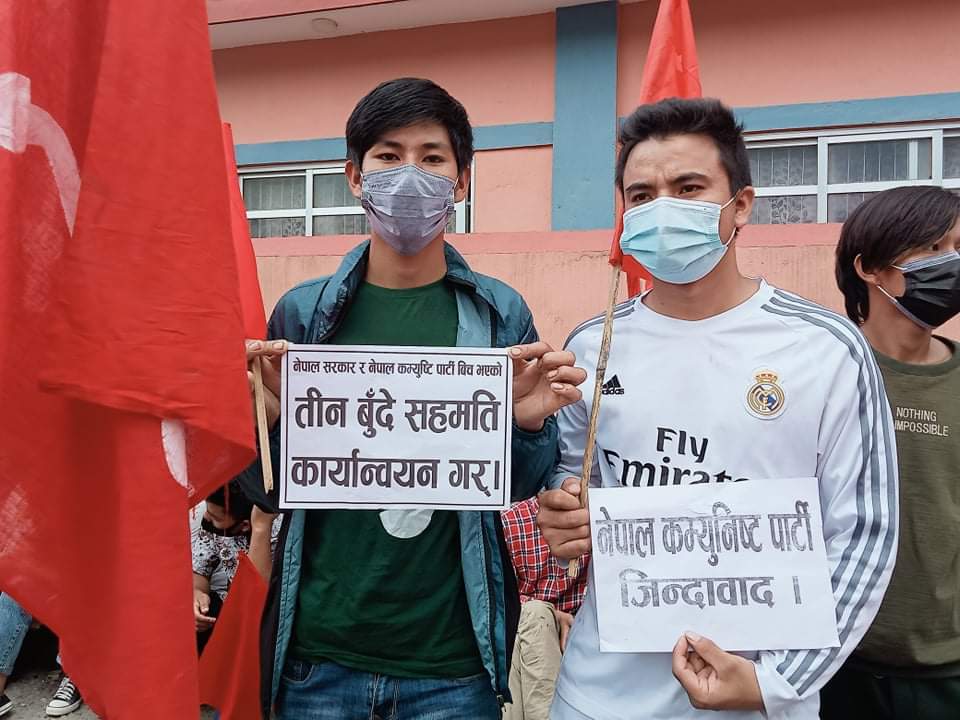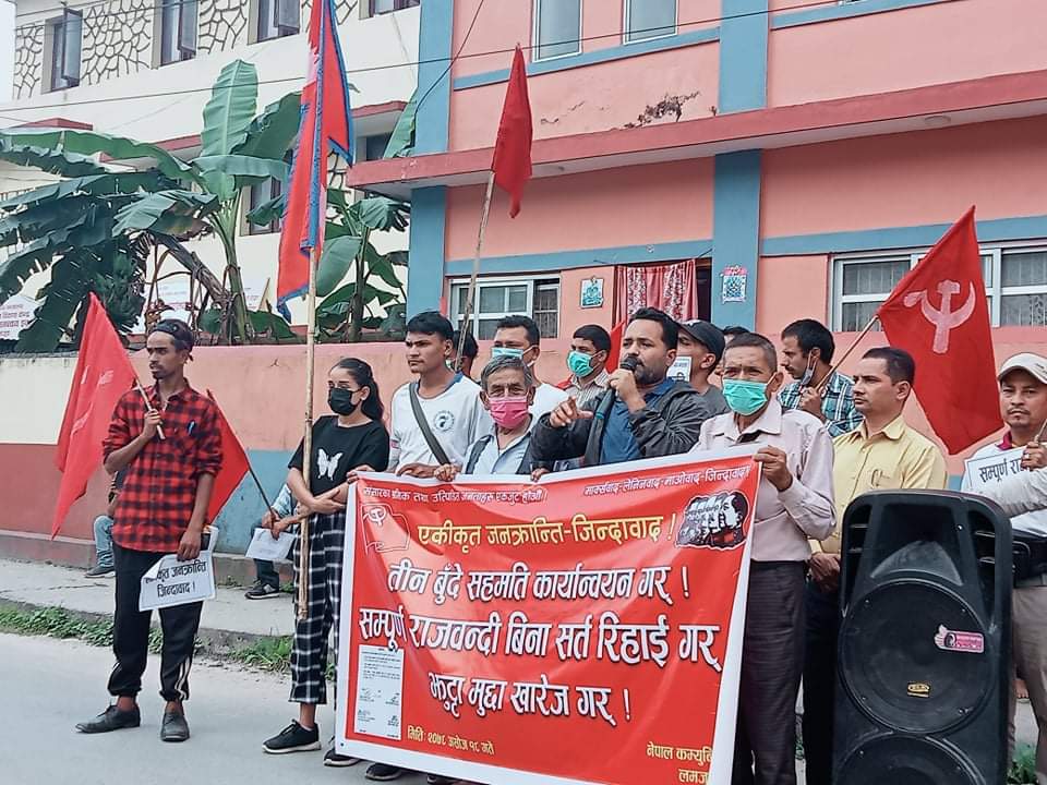 तीन बुँदे सहमतिको कार्यन्वयन,पार्टीका नेताकार्यकर्तामाथि लगाइएका झुठ्ठा मुद्धा खारेज र सम्पूर्ण राजबन्दी रिहाइको माग गर्दै नेकपाले आज देशव्यापी धर्ना दिएको छ ।