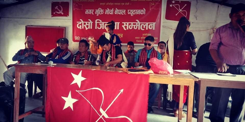 राजेन्द्र रावत क्षेत्री,असोज १९ ,प्युठान।विप्लव नेतृत्वको नेपाल कम्युनिस्ट पार्टी निकट जन वर्गिय संगठन मगर मुक्तिमोर्चा नेपाल,प्युठानकाे दाेस्राे जिल्ला सम्मेलन आज सम्पन्न भएको छ।सम्मेलनले नर बहादुर थापा मगरकाे अध्यक्षतामा २ जना पछि थप्ने गरि १५ सदस्यीय मगर मुक्तिमोर्चा नेपाल जिल्ला कार्यसमिति निर्वाचित गर्दै सम्पन्न भएको हाे ।