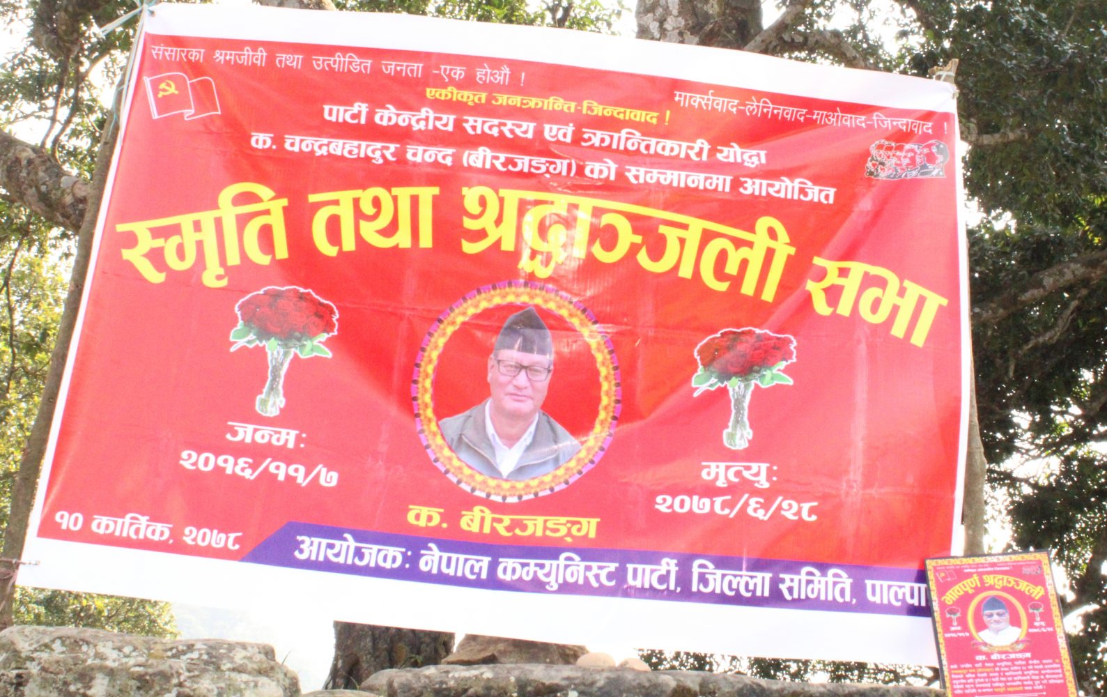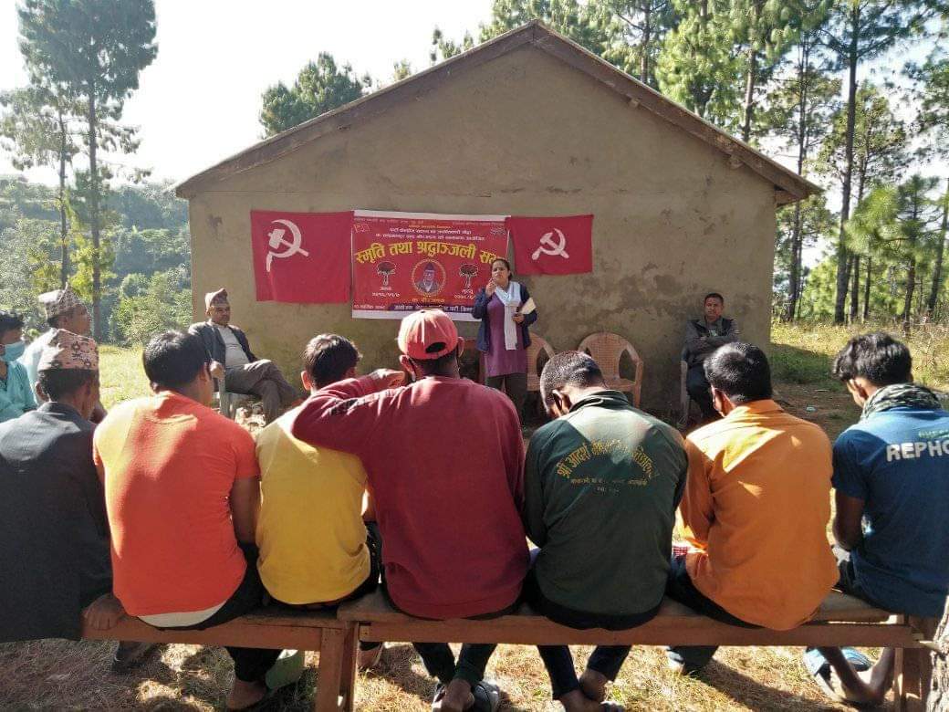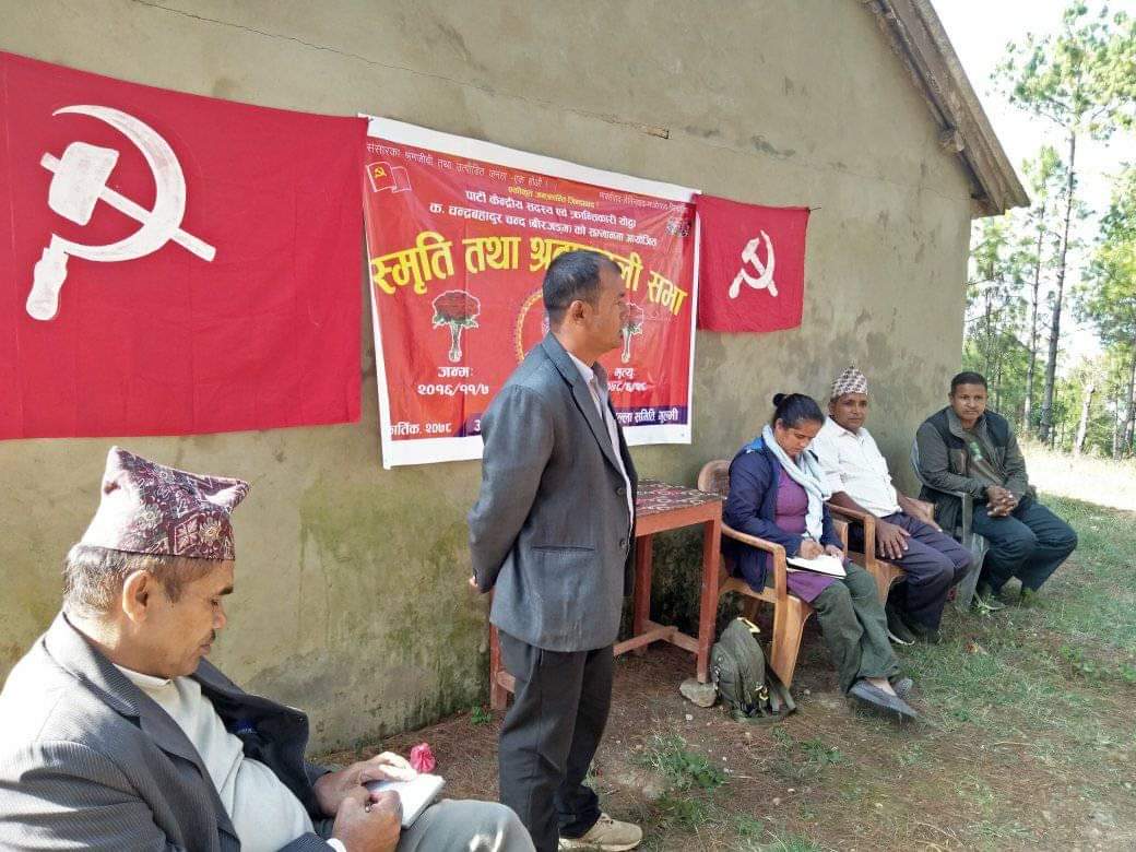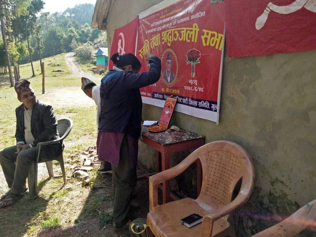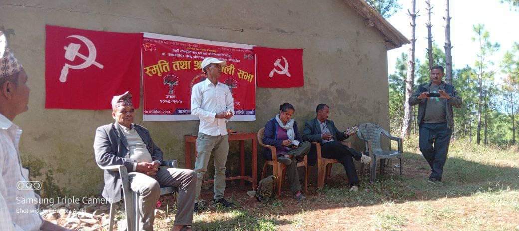 उक्त स्मृति सभाका अध्यक्ष नेकपा तिनाउ गाँउपालिकाका सेक्रेटरी कमरेड मदनले गर्नु भएको थियोे भने कार्यक्रम संचालन एरिया कमिटी सदस्य कमरेड कुशलले गर्नु भएको थियो ।उता गुल्मीमा स्मृति सभा सम्पन्न भएको छ । उक्त सभाका प्रमुख अतिथि नेपाल कम्युनिस्ट पार्टीका गुल्मी ईन्चार्ज अपेक्षाले उहाँले देखाएको बाटोमा आफुहरु सधैं हिडिरहने प्रतिबद्धता व्यक्त गर्नु भयो । कार्यक्रमकाे सभा कमरेड बसन्तले गर्नु भएको थियोे भने कार्यलय सचिव कमरेड विनोदले संचालन गर्नु भएको थियो ।