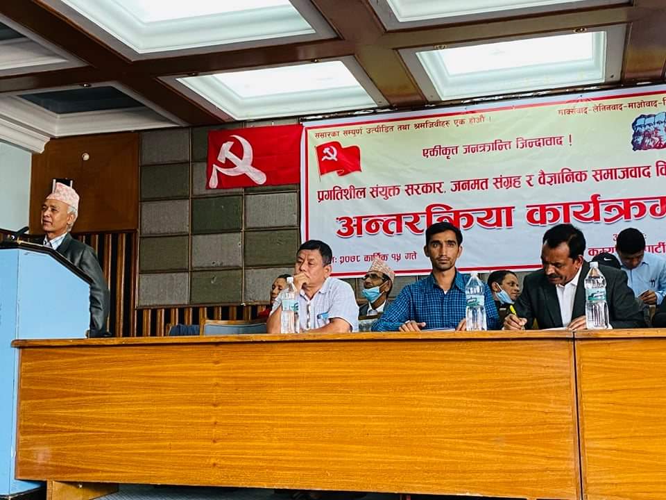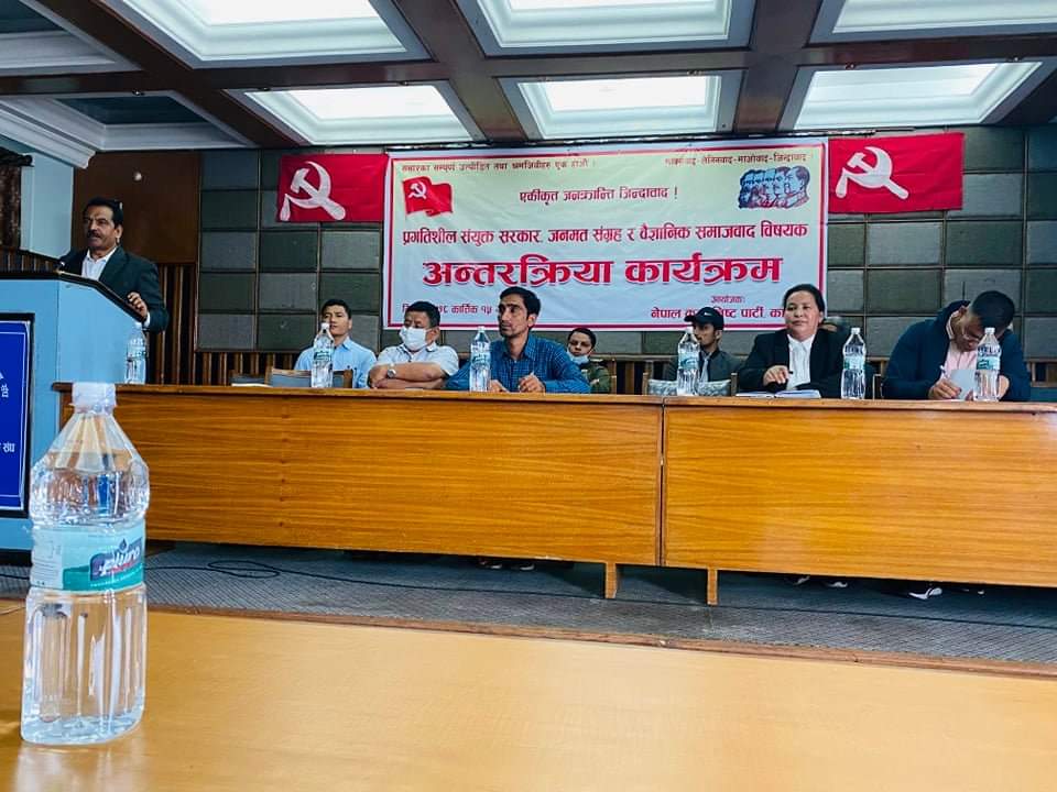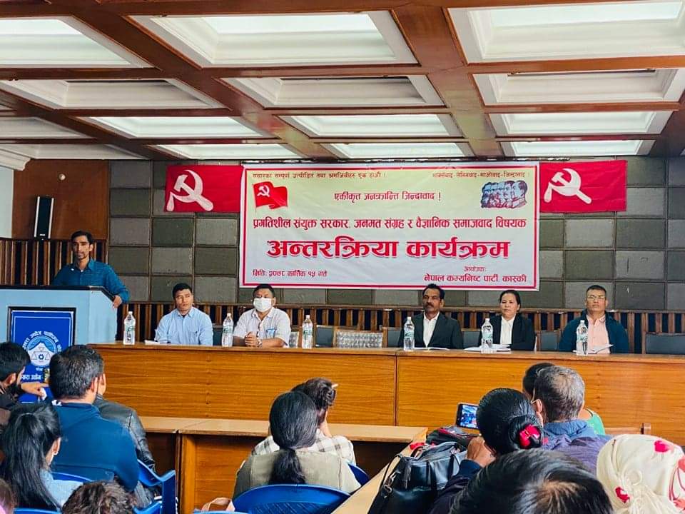 नेपाल कम्युनिस्ट पार्टी कास्की जिल्ला सेक्रेटरी गोकुल पराजुलीको अध्यक्षतामा भएको उत्त अन्तरक्रीया कार्यक्रममा नेकपा केन्द्रीय सदस्य एवं कास्की जिल्ला इन्चार्ज उमा भुजेल, कास्की जिल्ला बिशेष कमिटी सदस्य प्रकाश मल्ल लगायत पार्टीका नेता कार्यकर्ताहरुको समेत उपस्थिति रहेको थियो भने कार्यक्रम नेकपा कास्की जिल्ला कार्यलय सचिव काजि गुरुङले सञ्चालन गर्नुभएको थियो।