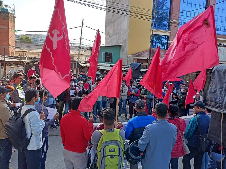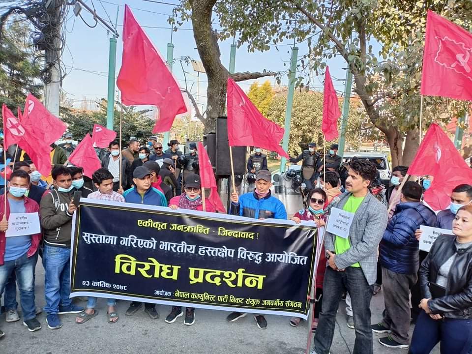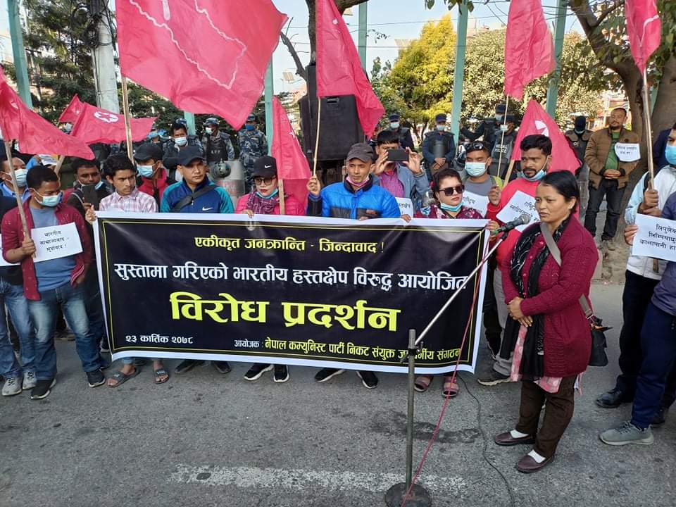 भारतीय हस्तक्षेप विरुद्ध नेकपा निकट जनवर्गीय संगठनहरुले आज दिउसो माइतीघर मण्डलमा संयुक्त रुपमा विरोध प्रदर्शन गरेका हुन् ।