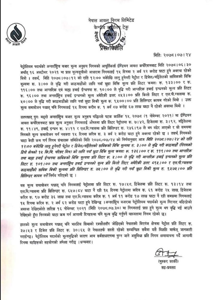 यसअघि निगमले कात्तिक १२ गतेमात्र इन्धनको भाउ बढाएको थियो । १२ दिनपछि नै मूल्य बढेको हो । बढेको भाउमा तेल बेच्दा पनि निगमलाई १५ दिनमा पौने ३ अर्ब रूपैयाँ घाटा हुने दाबी उसको छ । १५ दिनमा निगमलाई २ अर्ब ६२ करोड घाटा हुने निगमको प्रक्षेपण छ।