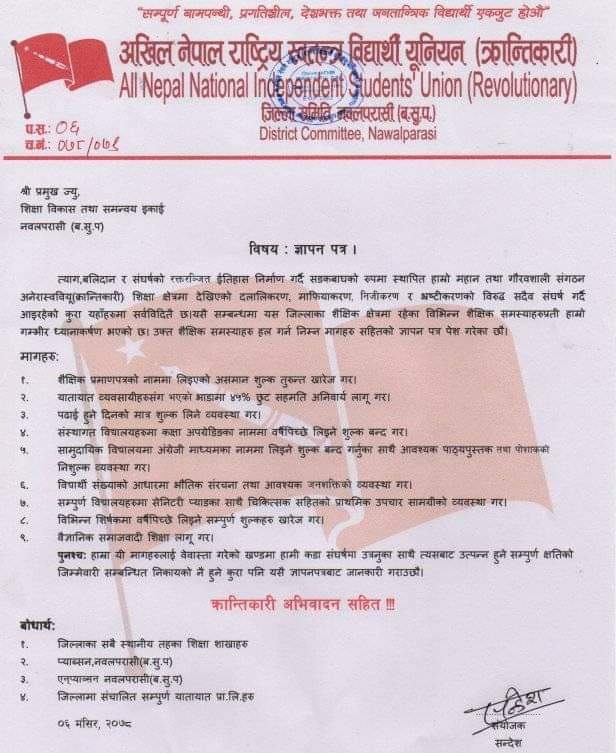 अखिल(क्रान्तिकारी) नवलपरासीका संयोजक सन्देशद्वारा हस्ताक्षरित बुझाइएको ज्ञापनपत्रमा मागहरु निम्नानुसार छ्न: