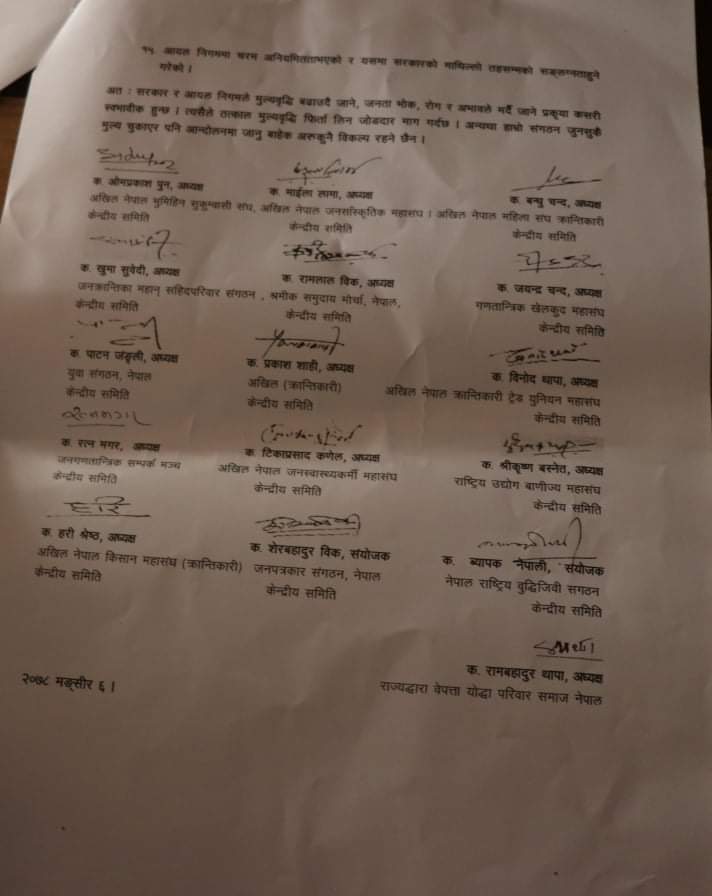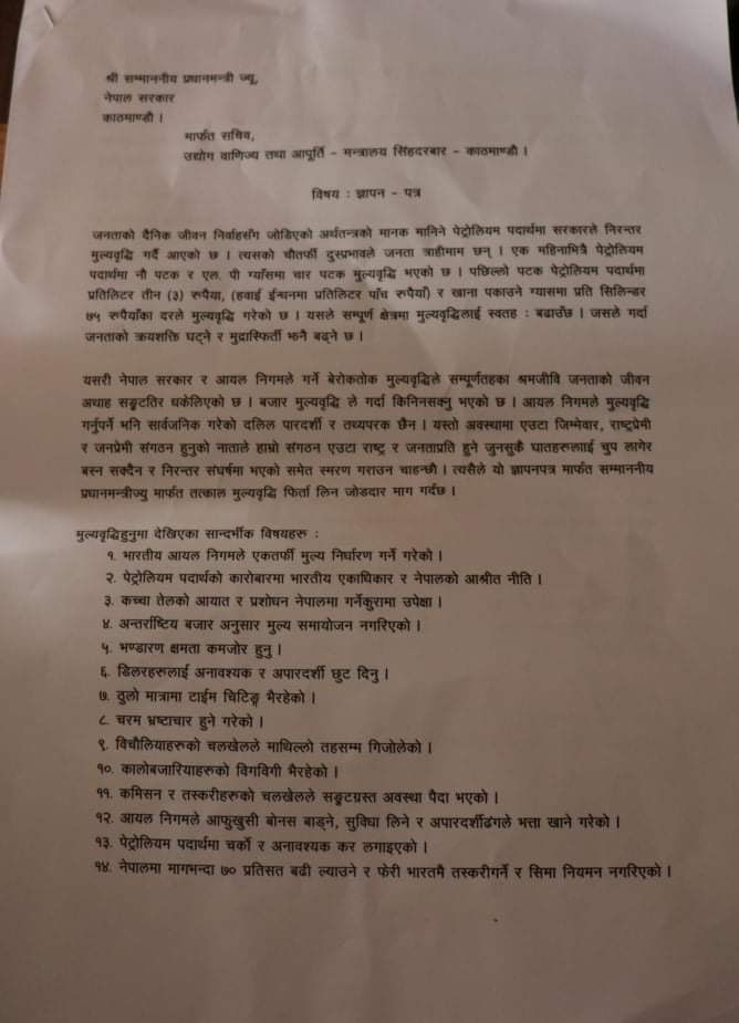 नेकपा निकट १६ वटा जनवर्गीय संगठनहरुले जनताको दैनिक जीवन निर्वाहसँग जोडिएको अर्थतन्त्रको मानक पेट्रोलियम पदार्थमा सरकारले निरन्तर गरेको मूल्यवृद्धिको विरोधमा उद्योग वाणिज्य तथा आपूर्ति मन्त्रालय सिंहदरवार, मार्फत प्रधानमन्त्री देउवालाई ज्ञापनपत्र बुझाएका हुन् ।