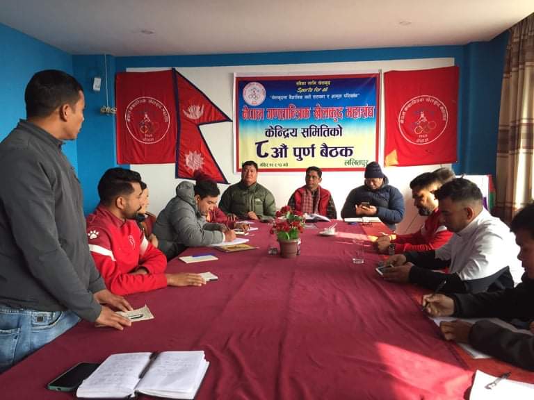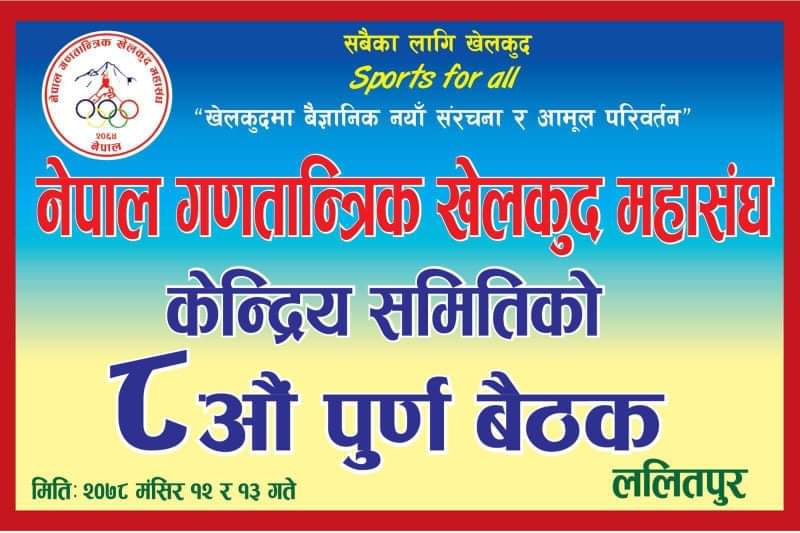 मुक्ति गैरे,मंसिर १३,काठमाडौ।नेपाल कम्युनिस्ट पार्टी निकट नेपाल गणतान्त्रिक खेलकुद महासंघ आठाैं पुर्ण बैठक काठमाडौंमा सम्पन्न भएको छ। आइतबारदेखि काठमाडौंमा शुरु भएको बैठक अाज सम्पन्न भएको हो।