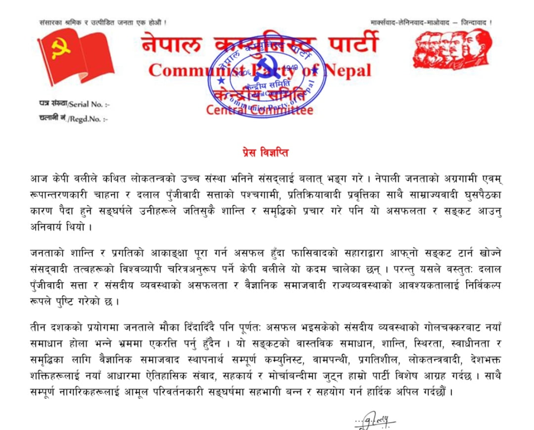 महासचिव विप्लव एक विज्ञप्ति मार्फत नेपाली जनताको अग्रगामी एवं रुपान्तरणकारी चाहना र दलाल पुँजीवादी राज्यव्यवस्थाको पश्चगामी, प्रतिक्रियावादी प्रवृत्तिका साथै साम्राज्यवादी घुसपैठका कारण पैदा हुने संघर्षले उनीहरुले जतिसुकै शान्ति र समृद्धिको प्रचार गरेपनि यो असफलता र संकट आउनु स्वभाविक भएको बताएका छन् । उनले जनताको शान्ति र प्रगतिको आकांक्षा पुरा गर्न असफल हुँदा फासीवादको सहारामा आफ्नो संकट तार्न खोज्ने संसदवादी तत्वको विश्वव्यापी चरित्र अनुसार केपी वलीले संसद विघटनजस्तो कदम चालेको बताएका छन् । संसदीय व्यवस्थाको गोलचक्करबाट जनताको समस्या समाधान होला भन्ने भ्रममा पर्नु गलत भएको भन्दै महासचिव विप्लवले यो संकटको वास्तविक समाधान, शान्ति, स्थीरता, स्वाधीता र समृद्धिका लागी वैज्ञानिक समाजवाद स्थापनार्थ सम्पूर्ण कम्युनिस्ट, वामपन्थी, लोकतन्त्रवादी, प्रगतिशील, देशभक्त शक्तिहरुलाई नयाँ आधारमा ऐतिहासिक संवाद, सहकार्य र मोर्चाबन्दीमा जुट्न आग्रह समेत गरेका छन् ।