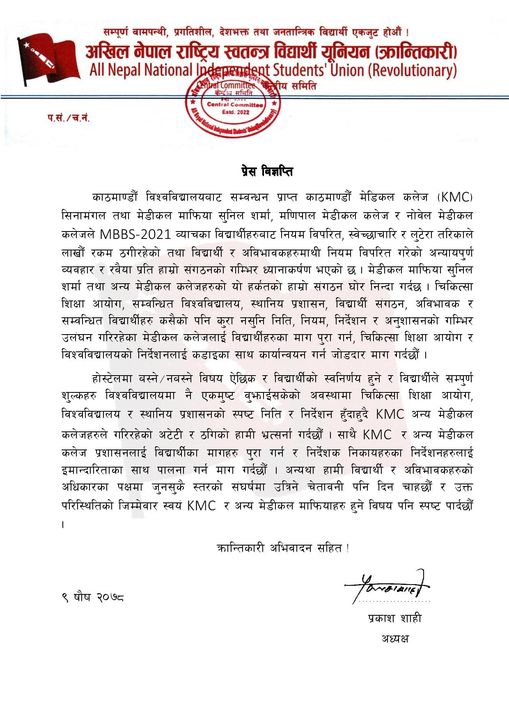 विज्ञाप्तिमा भनिएको छ”काठमाण्डौं विश्वविद्यालयबाट सम्बन्धन प्राप्त काठमाण्डौं मेडिकल कलेज (KMC) सिनामंगल तथा मेडीकल माफिया सुनिल शर्मा,मणिपाल मेडीकल कलेज र नोबेल मेडीकल कलेजले MBBS-2021 व्याचका विद्याधीहरबाट नियम विपरित, स्वेच्छाचारि र लुटेरा तरिकाले लाखौं रकम ठगीरहेको तथा विद्यार्थी र अविभावकहरुमाथी नियम विपरित गरेको अन्यायपुर्ण व्यवहार र रवैया प्रति संगठनको गम्भिर ध्यानाकर्षण भएको छ ।