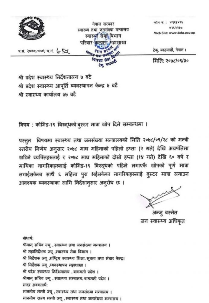जनसङ्ख्या मन्त्रालयले प्रदेशका स्वास्थ्य निर्देशनालय र जिल्ला स्वास्थ्य कार्यालयहरुलाई पत्र लेखेर भोलि माघ २ गतेदेखि अग्रपङ्क्तिमा खटिनेहरुलाई बुस्टर डोज दिन भनेकाे हो ।