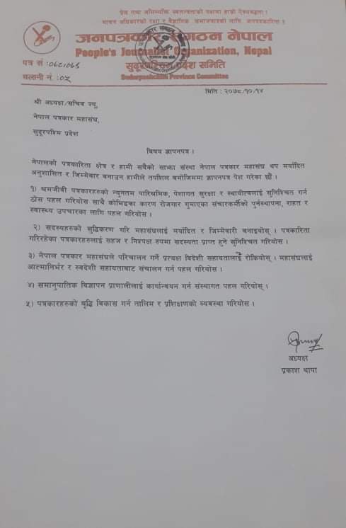 यसै गरि कैलाली,कञ्चनपुर,डडेल्धुरा रअछाम जिल्ला समितिले पनि नेपाल पत्रकार महासंघ जिल्ला शाखालाई ज्ञापन पत्र बुझाएको छ ।