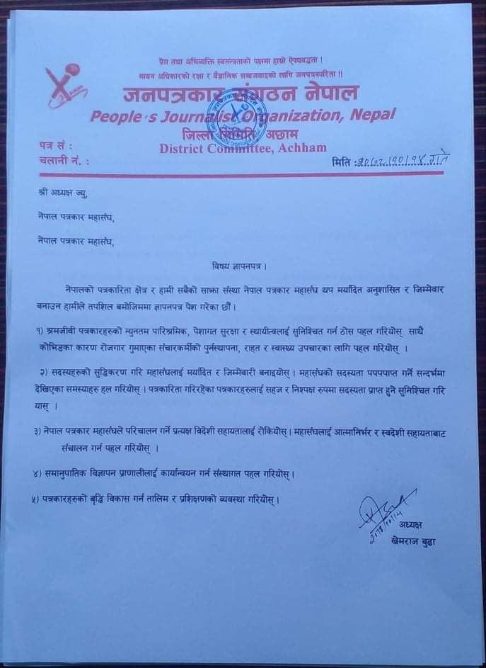 नेपाल पत्रकार महासंघ थप मर्यादित, अनुशासित र जिम्मेवार बनाउन जनपत्रकार संगठन नेपाल, जिल्ला समिति अछामले तपशिल बमोजिममा ज्ञापनपत्र पेश गरेकाे छ :-