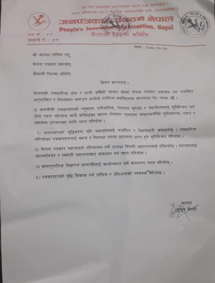 पुस्पा साउद/ माघ १४,कैलाली । जनपत्रकार सङ्गठन नेपाल, जिल्ला समिति कैलालीले मर्यादित ,अनुशासित र जिम्मेवार बन्न अपिल गर्दै विभिन्न मागहरू राखी नेपाल पत्रकार महासंघ सुदुरपश्चिम शाखा र कैलाली शाखा लाई १४ गते शुक्रबार ज्ञापन पत्र बुझाएको छ । महासंघ सुदूपश्चिम प्रदेश शाखा सचिव हरी जोशीले ज्ञापन पत्रमा उल्लेख गरिएका बुँदाहरू पत्रकार हरुकारहरुका हकहितका लागि भएको र यी मागहरूलाई संसोधन गर्न यजेण्डा बनाई संस्थागत रूपमा पहल गर्ने प्रतिबद्धता जाहेर गरेका थिए ।