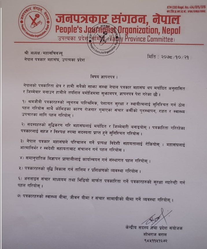 संगठनका केन्द्रीय सदस्य तथा उपत्यका प्रदेश संयोजक शोभराज बरालको नेतृत्वमा गएको टोलीले महासंघका उपत्यका प्रदेश अध्यक्ष श्रीजन झालाई ज्ञापनपत्र बुझाइएको हो । नेपालको पत्रकारिता क्षेत्र र सम्पूर्ण पत्रकारहरुको साझा संस्था नेपाल पत्रकार महासंघलाई थप मर्यादित, अनुशासित र जिम्मेवार बनाउन भन्दै जनपत्रकार संगठनले ज्ञापनपत्र बुझाएको हो ।