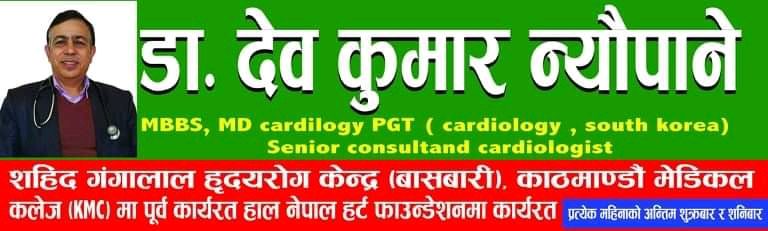शहिद गङालाल रास्ट्रीय हृदय रोग केन्द्र बासबारी काठमाडौ मेडिकल कलेज मा पुर्व कार्यरत नेपाल हर्ट फाउन्डेसन का बरिस्ठ मुटु रोग विशेष ज्ञ डाक्टर देव कुमार न्यौपाने माघ २८ र २९ गते शुक्रबार र शनिबार आउने हुदा मुटु रोग , मुटुको बाथ जन्म जात मुटु रोग , क्रोनरी मुटु रोग मुटुको चालको अनियमितता मुटुको संक्रमण , औषधि खादा पनी प्रेसर नघटनु धेरै टाउको दुख्नु छाती दुख्नु चक्कर लाग्नु हात खुट्टा सुन्निनु , धेरै मोटो हुनु धेरै पसिना आउनु निल्नमा समस्या आउनु वाक वाकी लाग्नु बोल्न अप्ठ्यारो हुने मुटु संबंधित सम्पूर्ण समस्या हरुको उपचार एउटै छानामुनी गरिने पराजुली ले बताउनु भयो ।