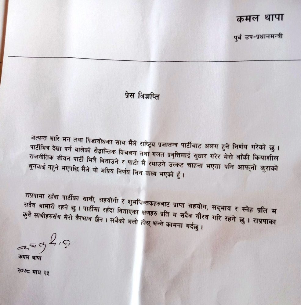 थापाले विज्ञप्ति जारि गर्दै आफूले राप्रपा परित्याग गरेको घोषणा गरेका हुन्।विज्ञप्ति: