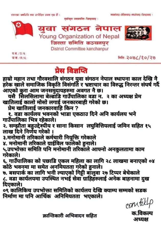 नेकपा कम्युनिस्ट पार्टी निकट युवा संगठनले कञ्चनपुरको बेलडाँडी गाउँपालिका वडा नं दुई एमालेबाट निर्वाचित अध्यक्ष प्रेम खातीलाई भ्रष्टाचार, अवैधानिक कर्मचारी नियुक्ति, बेजेटमा हिनामिना लगायतका अन्य आरोप लगाउँदै कार्यकक्षमै जनकारवाही स्वरूप कालोमोसो दलेका छन् । विगत लामो समयदेखिको जनगुनासो र विवाद पछि उनलाई कारबाही गरिएको हो ।