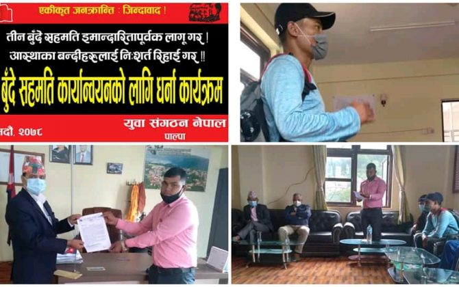 पुरा पढ्नुहोसभाद्र ३०,अर्घाखाँची।नेपाल कम्यूनिस्ट पार्टी निकट युवा संगठन नेपाल अर्घाखाँचीले जिल्ला प्रशासन कार्यलय अर्घाखाँचीमा ३ बुँदे सहमती इमान्दारीता पुर्वक कार्यन्यन गर्न माग गरेको छ । बुधबार दिउँसो २ बजेतिर प्रशासन कार्यालय अगाडी धर्ना कार्यक्रम र कार्यालय...