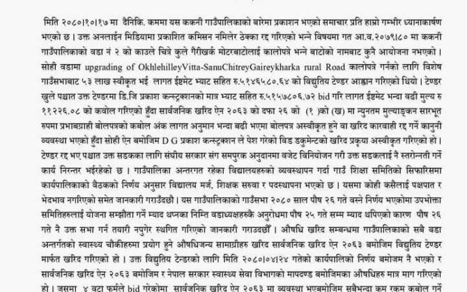 पुरा पढ्नुहोसकाठमाडौं । नुवाकोटको ककनी गाउँपालिकाले पालिकाका विषयमा भ्रामक समाचार प्रकाशन भएको भन्दै आपत्ति जनाएको छ । पालिकाका अध्यक्ष सुमन तामाङ सज्जन र निमित्त प्रशासकीय अधिकृत ऋषि अधिकारीले विज्ञप्ति जारी गर्दै एक अनलाइनमा प्रकाशित सडक निर्माणमा...