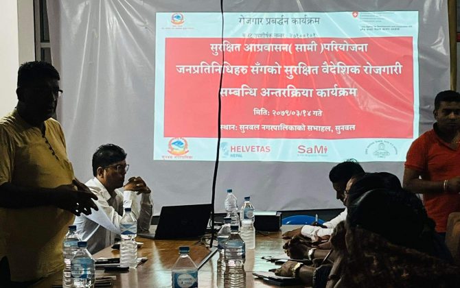 पुरा पढ्नुहोसगल्याङ।गल्याङमा सुरक्षित आप्रवासन(सामी)परियोजनाको अभिमुखिकरण कार्यक्रम सम्पन्न भएको छ। सुरक्षित बैदेशिक रोजगारीका क्षेत्रमा काम गरिरहेको सामी परियोजनाले गल्याङ नगरपालिकाको कार्यपालिका सदस्य तथा शाखा प्रमुखहरुका लागि अभिमुखिकरण कार्यक्रमको आयोजना गरेको हो। कार्यक्रममा गल्याङ नगरपालिका प्रमुख गुरु प्रसाद भट्टराईले...