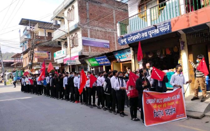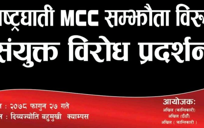 पुरा पढ्नुहोसफागुन २६,पोखरा।एमसीसी विरुद्ध बिप्लब नेतृत्वको नेकपा निकट अखिल (क्रान्तिकारी)सहित नेकपा मसाल निकट अखिल (छैठौं) र ऋषि कट्टेल नेतृत्वको नेपाल कम्युनिस्ट पार्टी निकट अखिल नेपाल विद्यार्थी युनियनको संयुक्त मोर्चाले विरोध सभा सहित प्रदर्शन गरेका छन्। विरोध...