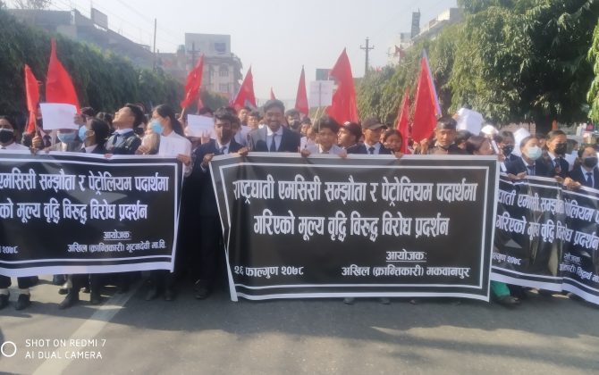 पुरा पढ्नुहोसनवलपरासी । विप्लव नेतृत्वको नेकपा निकट बिद्यार्थी संगठन अखिल(क्रान्तिकारी)सहित तीन बिद्यार्थी संगठनले एमसीसी पारित र मुल्य वृद्धिका बिरुद्ध बिरोध सभा गरेका छन् । विप्लव नेतृत्वको नेकपा निकट अखिल (क्रान्तिकारी) नेकपा(मसाल)निकट अखिल (छैठौ) र क्रान्तिकारी...