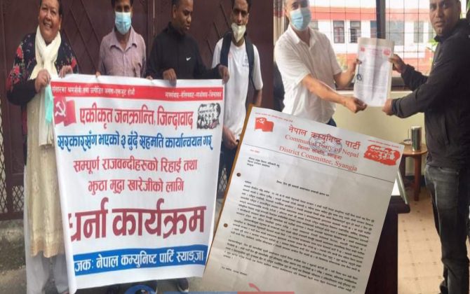 पुरा पढ्नुहोसअसोज १८ स्याङ्जा । विप्लव नेतृत्वको नेकपा कम्युनिस्ट पार्टीले स्याङ्जाको जिल्ला प्रशासन कार्यलयमा धर्ना एवं कोणसभा सम्पन्न गरेको छ।सरकार र नेकपा बिच भएको तीन बुँदे सहमति कार्यान्वयन गर्न दबाब स्वरुप नेकपाले जिल्ला प्रशासन कार्यालय...