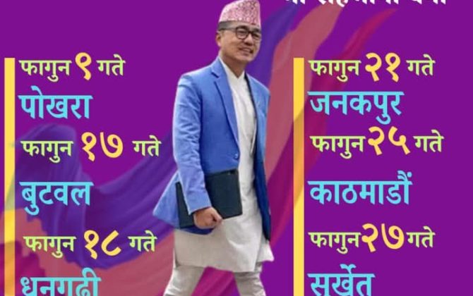 पुरा पढ्नुहोसराष्ट्रिय प्रजातन्त्र पार्टी (राप्रपा) ले फागुन १७ गते बुटवलको ट्राफिक चोकमा विरोध सभा आयोजना गर्ने भएको छ।बिरोध सभामा पार्टीका केन्द्रिय अध्यक्ष राजेन्द्र लिङ्देन सहित पार्टीका विभिन्न तहका नेताहरू सम्बोधन गर्ने कार्यक्रम तय भएको हो...