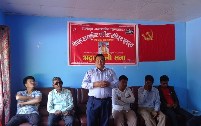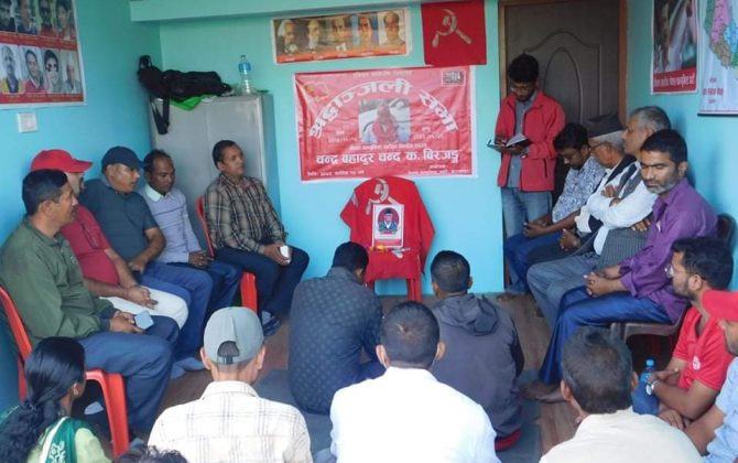 पुरा पढ्नुहोसकमल विक,अछाम,कार्तिक १०। नेपाल कम्युनिस्ट पार्टी अछामले नेकपाका बरिष्ठ केन्द्रीय सदस्य चन्द्र ब. चन्द( वीरजंग) को सम्झनामा श्रदाञ्जली सभा सम्पन्न गरेकाे छ। बुधबार अछामको तुर्माखाद बजारमा सम्पन्न गरिएको हो। वीरजंग लामो समयको हिरासत बसाइँमा रहँदा...