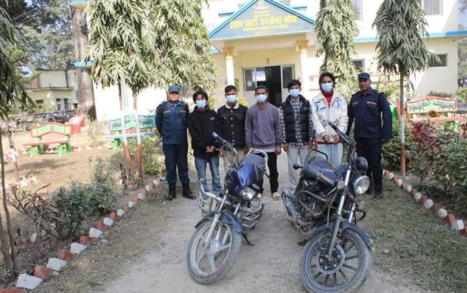 पुरा पढ्नुहोसपरासी । पश्चिम नवलपरासी प्रहरीले चोरीका मोटरसाइकल सहित ५ जनालाई पक्राउ गरेको छ । जिल्लाको विभिन्न स्थानबाट मोटरसाइकलबाट चोरी गरि चलाइएको अवस्थामा प्रहरीले उनीहरुलाई पक्राउ गरेको हो। उनीहरुको साथबाट चोरी गरि चलाएको अवस्थामा बा...