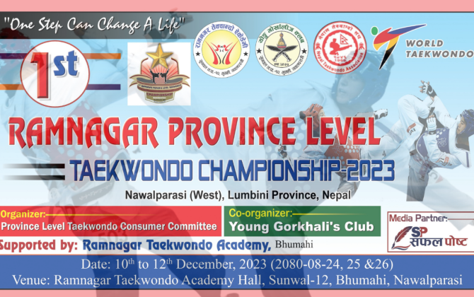 पुरा पढ्नुहोससुनवल । पश्चिम नवलपरासीको भुमहीमा लुम्विनी प्रदेश स्तरीय तेक्वान्दो प्रतियोगिता हुने भएको छ । प्रदेश स्तरीय तेक्वान्दो समितिको आयोजानामा आगामी मसिर २४ गतेदेखि भुमहीमा प्रथम रामनगर प्रदेश स्तरीय तेक्वान्दो प्रतियोगिता हुने लागेको हो। प्रदेश स्तरीय...