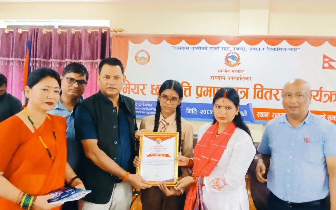 पुरा पढ्नुहोसपरासी।पश्चिम नवलपरासीको रामग्राम नगरपालिकामा २ सय ५० विद्यार्थीलाई मेयर छात्रवृत्ति वितरण गरिएको छ।रामग्राम नगर भित्रका रहेका २२ निजी विद्यालयमा नि:शुल्क अध्ययन गर्नेगरि २ सय ५० विद्यार्थीलाई छात्रवृत्ति गरिएको हो। निजी तथा आवासीय विद्यालय अर्गनाईजेसन (प्याब्सन)...