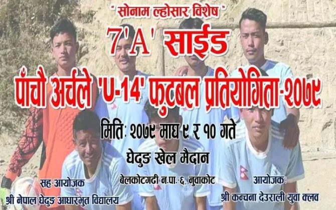 नुवाकोट। यसवर्षको चौध वर्षमुनिको सेभेन ए साइड पाँचौँ अर्चले फुटबल प्रतियोगिता भोली सुरु हुँदैछ । कञ्चना देउराली युवा क्लब नुवाकोटको आयोजनामा हुँदै आएको प्रतियोगितामा यस वर्ष ८ टोली सहभागी हुने आयोजकले जनाएको छ । नुवाकोटको...