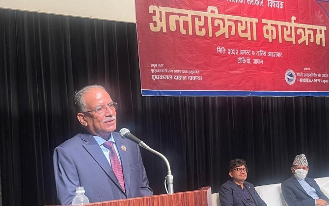 काठमाडौँ।नेकपा(माओवादी केन्द्र)का अध्यक्ष पुष्पकमल दाहाल ‘प्रचण्ड’ ले समृद्ध मुलुक निर्माणको लागि विदेशमा रहेका नेपालीको भूमिका महत्वपूर्ण रहने बताउनुभएको छ। ‘समृद्ध नेपालको आधार, आर्थिक क्रान्तिमा प्रवासी नेपालीको सरोकार’ विषयक अन्तरक्रिया कार्यक्रमलाई आज जापानको राजधानी टोकियोमा...