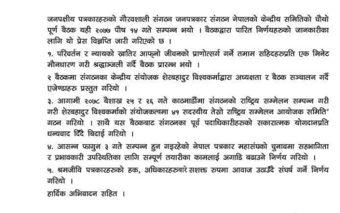 पुरा पढ्नुहोसपुष १६ काठमाडौ ।जनपत्रकार संगठन नेपालको केन्द्रीय समितिको चौथो पूर्ण बैठक पौष १४ गते सम्पन्न बैशाख २५ र २६ गते राष्ट्रिय सम्मेलन गर्ने गरि शेरबहादुर विश्वकर्माको संयोजकत्वमा ४१ सदस्य राष्ट्रिय सम्मेलन समिती गठन । संगठनको...