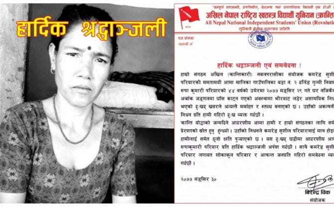पुरा पढ्नुहोसनवलपरासी । नेपाल कम्युनिस्ट पार्टी अखिल ( क्रान्तिकारी ) नवलपरासीका संयोजक सुशील परियारलाई मातृशोक संगठन द्वारा श्रद्धाञ्जली व्यक्त । अखिल (क्रान्तिकारि) नवलपरासीका संयोजक परियारकि आमा रूपाकुमारी परियारको ४४ बर्षको उमेरमा सोमबार घर नजिकैको अर्चाक जङ्गलमा...
