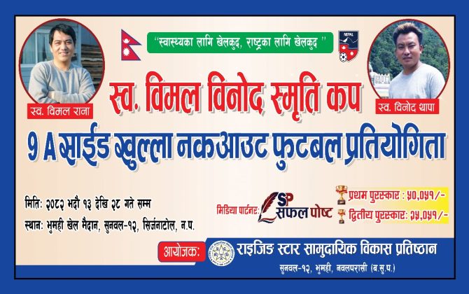 सुनवल।पश्चिम नवलपरासीको सुनवल नगरपालिका-१२, भूमहीमा ९ “ए” साइड खुल्ला नकआउट फुटबल प्रतियोगिता आयोजना हुने भएको छ।राइजिङ स्टार सामुदायिक विकास प्रतिष्ठानको आयोजनामा स्व. बिमल राना र स्व.विनोद थापाको स्मृतिमा फुटबल प्रतियोगिता हुने प्रतियोगिता आगामी भदौ...