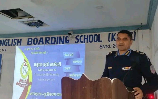 पुरा पढ्नुहोसनवलपरासी।पश्चिम नवलपरासीको बर्दघाट नगरपालिका वडा नं.-४ स्थित कुमुदिनी ईङ्गिलस बोडिङ्ग स्कुलमा आत्महत्या न्यूनिकरण सम्बन्धी सचेतना कार्यक्रम शुक्रबार सम्पन्न भएको छ। ‘समुदाय प्रहरी-साझेदारी’कार्यक्रम अन्तर्गत जिल्ला प्रहरी कार्यालय पश्चिम नवलपरासीको आयोजनामा भएको सचेतना कार्यक्रममा प्रमुख जिल्ला अधिकारी...