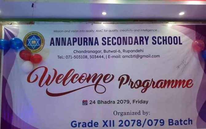 पुरा पढ्नुहोसबुटवल।बुटवल स्थिति अन्नपुर्ण मोडल कलेजले कक्षा ११ मा भर्ना भएका विधार्थीलाई स्वागत कार्यक्रम सहित विविध कार्यक्रम गरेको छ।कलेजमा एक कार्यक्रमका विच नवआगन्तुक विधार्थीलाइ स्वागत र विविध विधामा उत्कृष्ट विधार्थीलाई सम्मान गरेको हो। मिस्टर/मिस अन्नपूर्ण-२०७९...