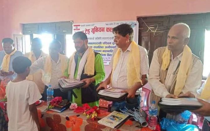 पुरा पढ्नुहोसपरासी।नेपाल ट्रेड युनियन कांग्रेस नवलपरासीले अनौपचारिक बालशिक्षा अन्तर्गत श्रमिकका बालबालिकाहरुलाई शैक्षिक सामाग्री बितरण गरेको छ।जिलाफको सहयोगमा संचालित अनौपचारिक बालशिक्षा अन्तर्गतका ४५ जना बालबालिकाहरुलाई शैक्षिक सामाग्री वितरण गरेको छ।नेपाल ट्रेड युनियन कांग्रेस नवलपरासीका अध्यक्ष ज्ञानहरि...